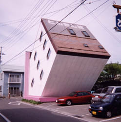 The pink building's name and use - the answer This building is a famous guesthouse in a town called Matsumotoshi 松本市 in the Nagano 長野県 (Chuubu area). The writing on the roof is さかさ レスト とんちん館 pronounced as "sakasa resuto tonchinkan" means upside down hotel/guesthouse. Tonchinkan とんちん館 and kanji: 頓珍漢 are both pronounced as Tonchinkan but 頓珍漢 means in Japanese = absurdity. This tonchinkan is a play of kanji words to mean two things: absurdity and guesthouse , i.e. a clever double meaning. Here are some photos: Just inside and past the entrance, sign at the entrance, menu and the car park view at the back. -whistle The following shows how you get there and the specials on the menu which is fish curry, first item and the second is omelette and rice. Go there and see for yourself. さかさレスト とんちん館 住所 長野県松本市島内5030 営業時間 10:00~22:00 定休日 月曜日 紹介メニュー さかさカレー 680円 オムライス 680円 交通 JR大糸線 島内駅下車 徒歩5分