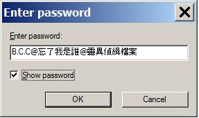i'd never try winzip before. make sure it support chinese character. The password is "B.C.C@忘了我是誰@靈異偵緝檔案" without quote